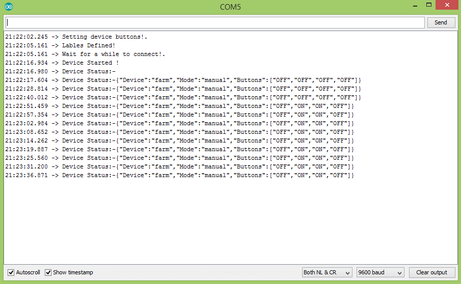 The Output Pins of CavyIoT-DevBoard shown above are responsive to the corresponding Buttons on the Control Panel. The frequency of sending sensor data to server and the frequency of receiving control signal from Control Panel of device, depends upon ping interval and it is configurable. User can set Ping Interval via programming device or from the Control Panel.