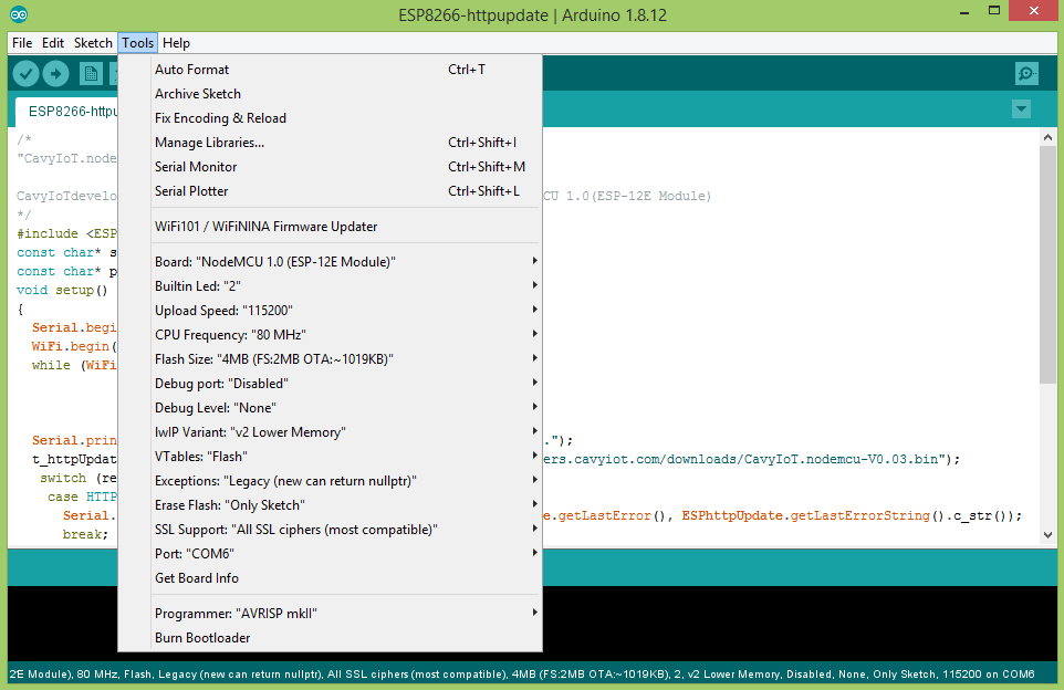 Then select board and COM port properly. (NodeMCU is selected in this example)