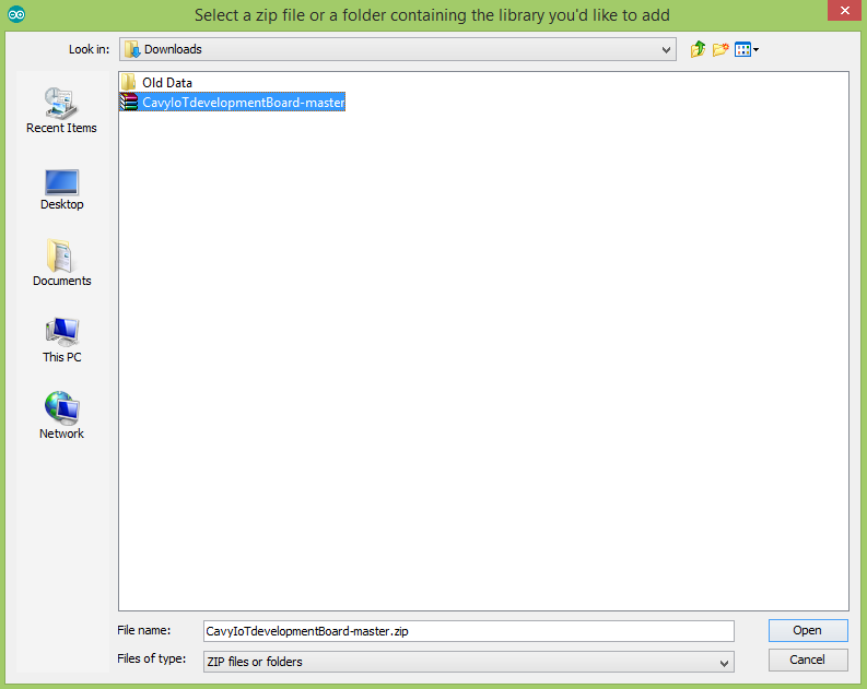 CavyIoTdevelopmentBoard.h library is available as a downloadable ZIP. Starting with Arduino IDE version 1.0.5, you can install 3rd party libraries in the IDE