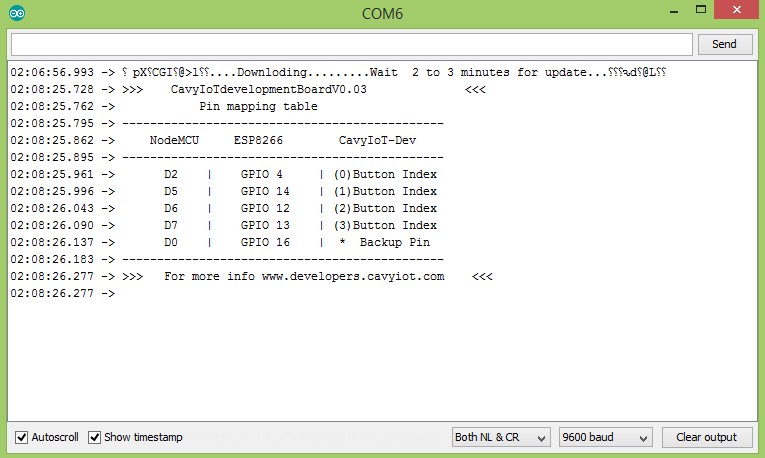 CavyIoT-DevBoard’s baud rate is 9600 and is fixed for serial communication (via rx , tx pins). CavyIoT-DevBoard recognize a line of Instruction when is send within enclosed chevrons followed by a carriage return. Device sends request to the CavyIoT server via internet, in defined interval to get the status of Control Panel, for an example if the user clicks the button on control panel, the device will receive control signal issued in the next ping (request). The pinging keeps the device in synchronization with the Control Panel. Default ping interval is 5 sec, setting ping interval to higher values slows the response time of device and vice versa . And sensor data sent to CavyIoT-DevBoard is get displayed on Control Panel for monitoring and processing.
