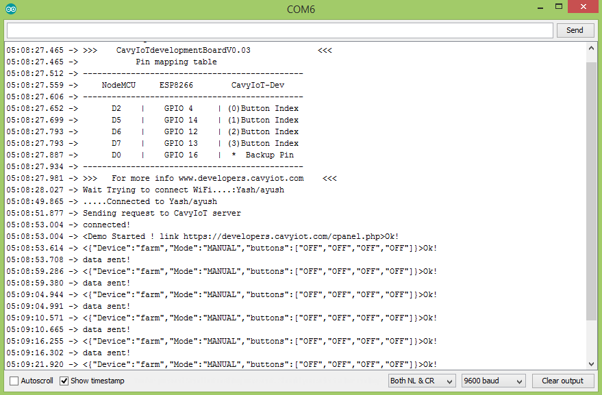 CavyIoT-DevBoard’s baud rate is 9600 and is fixed for serial communication (via rx , tx pins). CavyIoT-DevBoard recognize a line of Instruction when is send within enclosed chevrons followed by a carriage return. Device sends request to the CavyIoT server via internet, in defined interval to get the status of Control Panel, for an example if the user clicks the button on control panel, the device will receive control signal issued in the next ping (request). The pinging keeps the device in synchronization with the Control Panel. Default ping interval is 5 sec, setting ping interval to higher values slows the response time of device and vice versa . And sensor data sent to CavyIoT-DevBoard is get displayed on Control Panel for monitoring and processing.