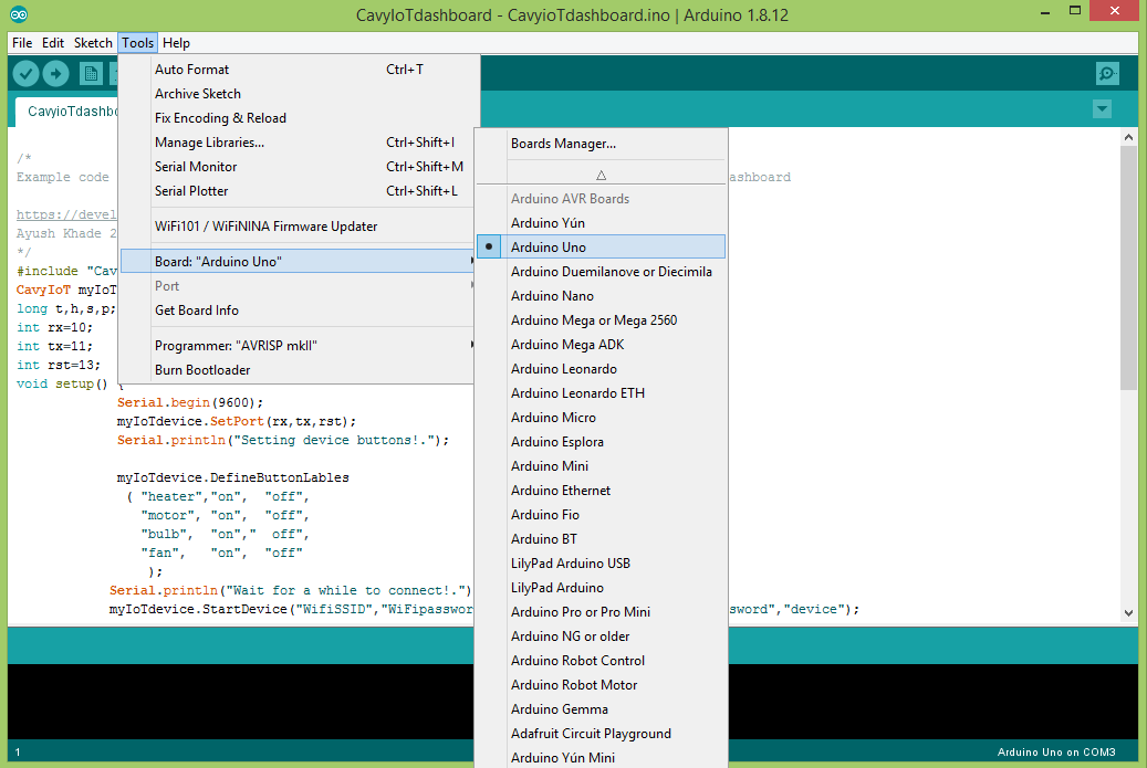 Using Example sketches in CavyIoTdevelopmentBoard.h you can flash firmware to ESP8266,NodeMCU or Wemos D1 R1. and library helps in communication between your hardware, CavyIoT Cloud and IoT Dashboard (Control Panel).